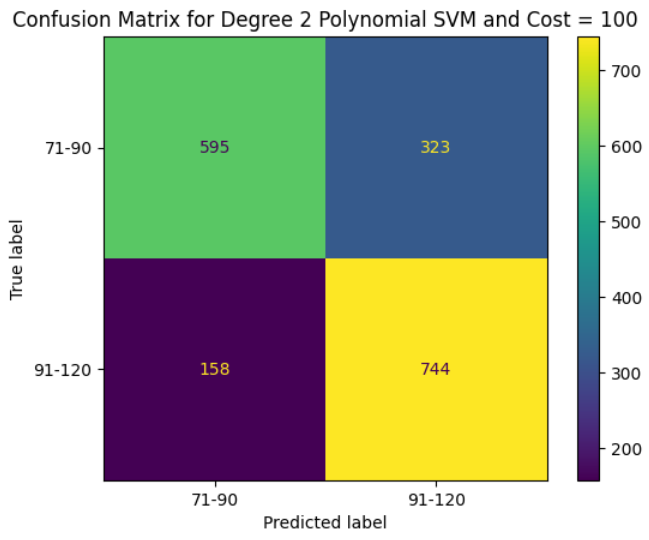 Implementing a polynomial degree 2 kernel to train SVM models created the below confusion matrices and corresponding performance outputs. Cost parameters of 1, 10, and 100 were applied. The below plots and performance summaries demonstrate, the degree 2 polynomial model with C = 10, outperformed the other models which exhibited both a higher and lower cost parameter. This model had a correct classification accuracy of ~75.5%. However, as with the polynomial degree 3 kernel, all three of these polynomial degree 2 models were victim to over-predicting the longer race category (100km).