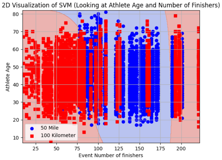 Support vector machines (SVM) are a supervised machine learning technique which will be applied in this context for binary classification. The models will attempt to determine the distance of a race result - 50 miles or 100 kilometer. SVMs are considered linear separators because they try to find a straight line between data points to enable easy classification. However, this straight line approach is onl applicable for 2-dimensional data, at higher dimensions the model creates a hyperplane to attempt to distinguish between classes.