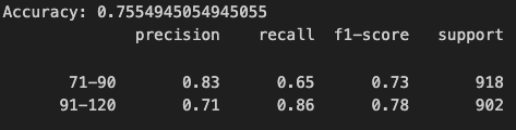 This model also outperforming all naive bayes and regression models tested. When considering the utra-running dataset this makes logical sense as their are not clear linear boundaries between classes and classes are not conditionally independent - leading to poor Naive Bayes performance.